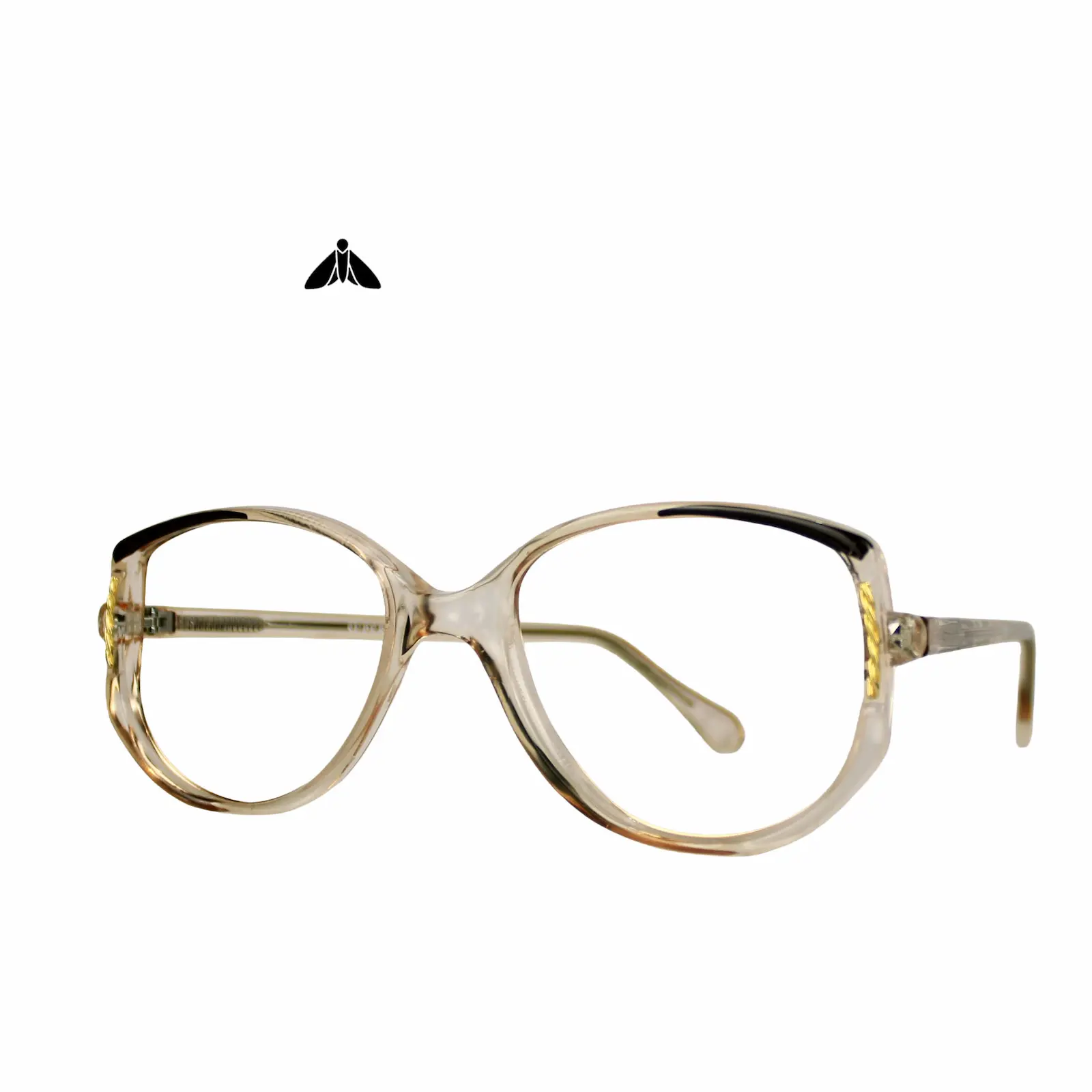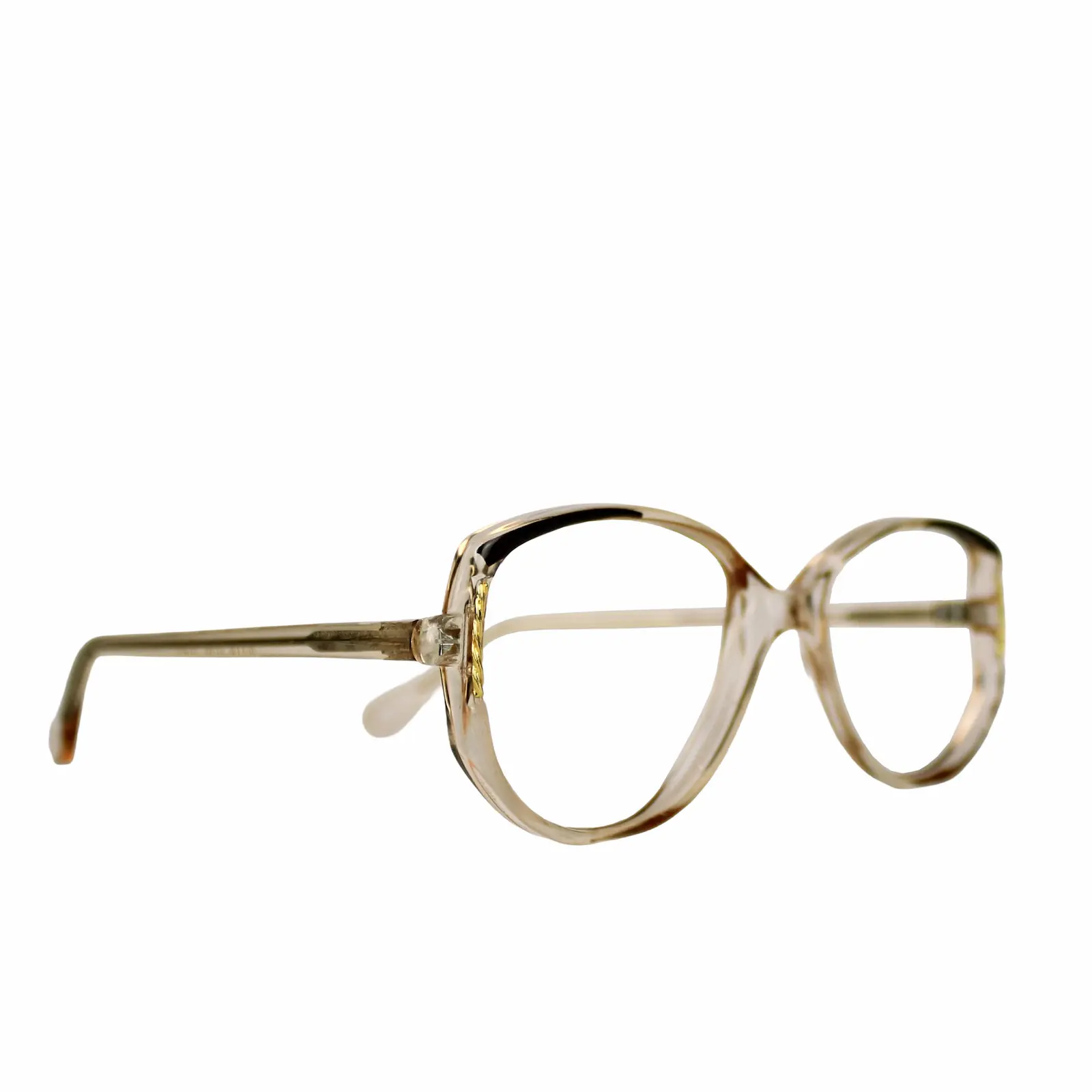 Bu gözlük, 70’lerin sonu ile 80’lerin başı arasında kalan o geçiş dönemine ait. Formu net ama yumuşak; geniş, hafif çekik bir silüete sahip. Oversize butterfly ile cat-eye arasında duran bu yapı, yüz hatlarını bastırmadan belirginleştirir. Ne tamamen feminen ne de serttir — dengede durur.